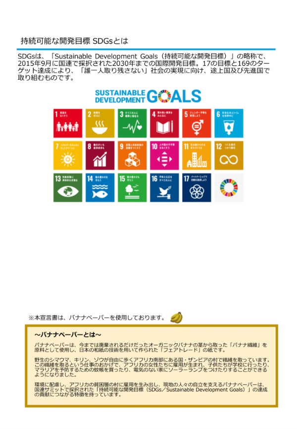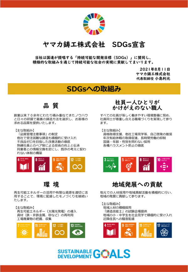 当社は、2021年8月11日、国連サミットで採択された「持続可能な開発目標(SDGs)」に賛同し、その取組について実行する宣言を致しました。